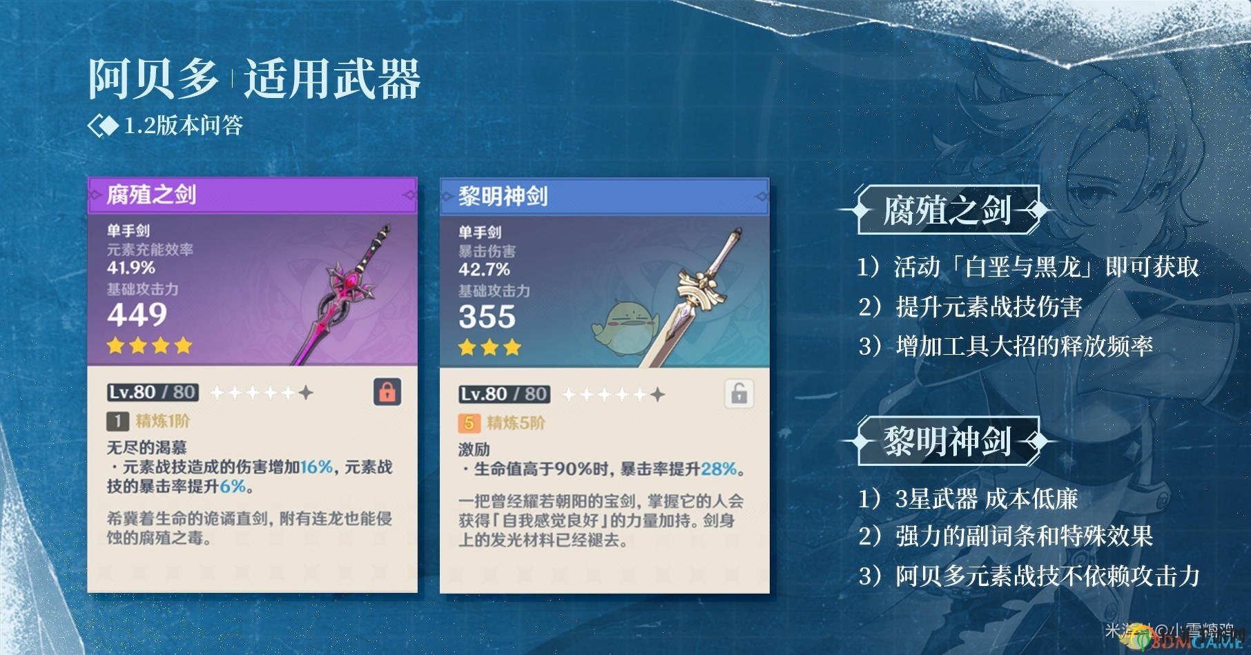 考虑到阿贝多堆防御、元素战技伤害完全取决于防御力的特性,阿贝多对强力武器的需求是相对较低的(或者说目前稀有武器都不太契合阿贝多)。