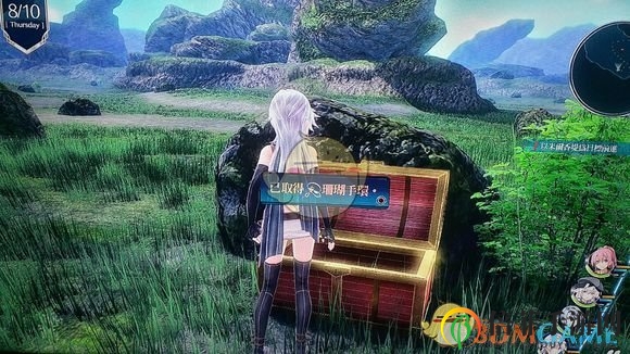 “必经之路右侧岩石后,开启第1个宝箱,获得:(珊瑚手环)图1和图2。”