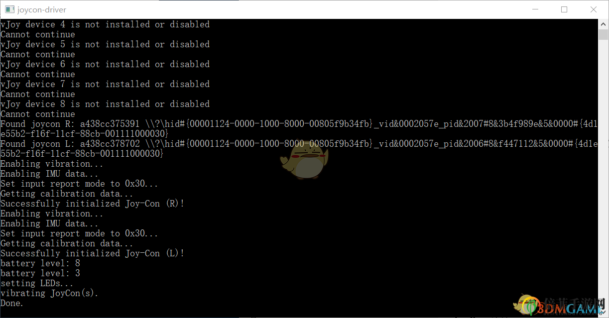 2、点击“Start”出现如下界面表示成功(此时手柄会震动一下,然后不闪烁)